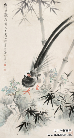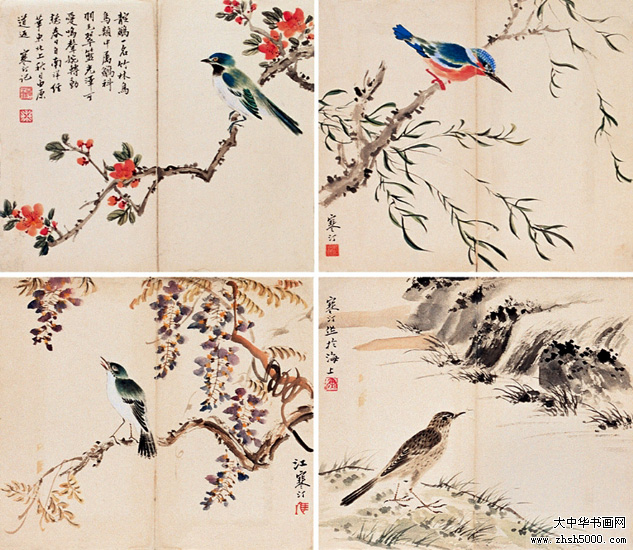 江寒汀(1904-1963),江苏常熟虞山镇人。又名江鸿,庚元、石溪、上渔、寒艇。十六岁从同里陶松溪习花鸟画,曾任教于上海美术专科学校。二十八岁开始卖画为生。中华人民共和国成立后为上海中国画院画师。为中国美术家协会会员,美协上海分会理事 。 曾任上海市第二、三届政协委员 。 纵观宋、元名迹,悟其谨严、放纵之情,对双钩填彩,没骨写生,均所擅长,尤擅描绘各种禽鸟,家中养许多鸟兽,以供写生之用。风格走清代华岩一路,笔墨老到,色彩明丽,形象生动,构图稳健,对虚谷、任颐的画风深有研究,偶尔仿制,几可乱真,有“江虚谷”之称。 传世作品有《杜鹊鹦鹉》、《白鹰》,20余丈的长卷《百鸟图》,1960年应周恩来总理邀请为人民大会堂绘制的巨幅《红梅图》等,亦有1983年上海人民美术出版社出版的《江寒汀百鸟图》,1992年古吴轩出版社出版的《当代名画家江寒汀》、北京荣宝斋出版的《花鸟画名家江寒洒画册》,1995年上海人民美术出版社出版的《江寒汀百卉册》等。 |